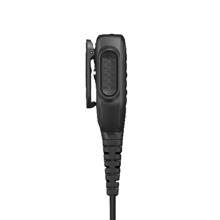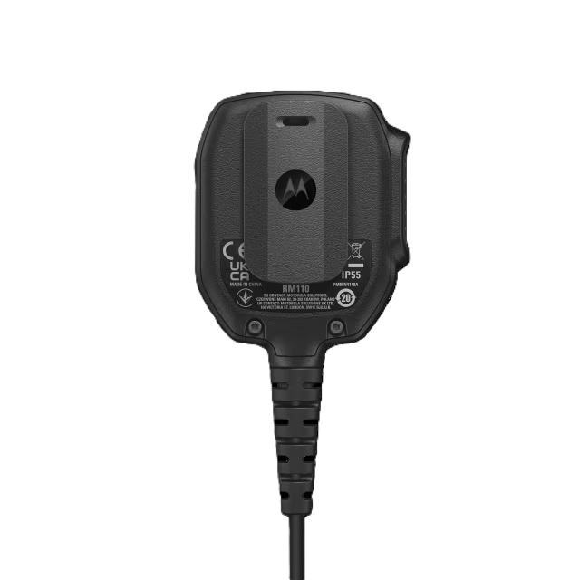 Designed for durability and ease of use, the RM110 features a compact yet rugged housing with an IP55 rating for dust and water resistance. The coiled cord provides flexibility, while the sturdy, low-profile swivel clip securely attaches the microphone to a shirt or lapel. The large Push-to-Talk (PTT) button is easy to operate, even with gloves on. This microphone is specifically optimized for the SINC+ noise cancellation feature available on compatible radios like the MOTOTRBO R2.